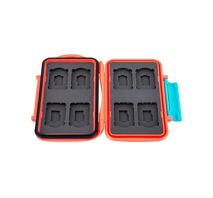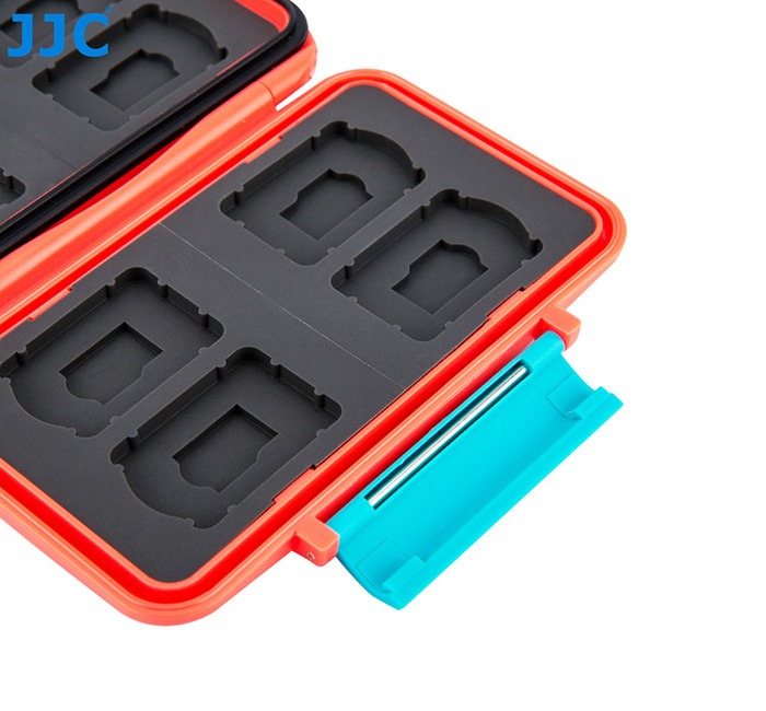 JJC MC-seriens Minneskortsfodral är en tufft vattenbeständigt ABS-fodral för lagring av minneskort. En gjuten skyddsTPU-gummilag skyddar mot skadliga stötar genom att säkra varje minneskort i MC-fodralet. Varje minneskortsplats är strikt anpassad för att passa kortet perfekt och skyddar korten från att åka runt. Fodralet antar en kompakt design, där båda sidorna låter dig lagra minneskort. Den vattentäta silikonförseglingen förhindrar oönskat skräp och vatten från att komma in i höljet. Det ergonomiska låsningssystemet håller korten säkra i minneskortsfodralet medan du enkelt kan öppna den med ditt finger. Dessutom har sidan av höljet ett hål för enkel bärning.